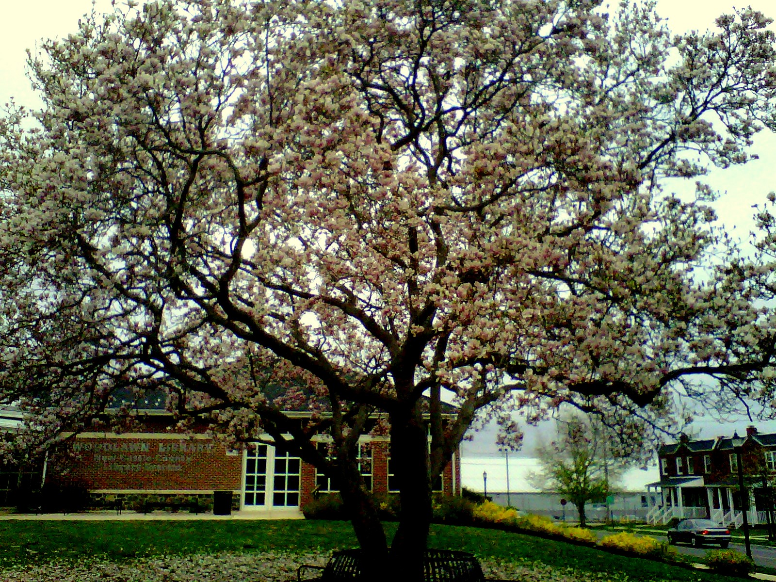 [Note on the photo: I took this earlier in the week, as I walked to the library. The day was gray and cloudy, threatening rain, but the roadways were lined with trees and shrubs in full bloom. Beautiful pink cherry trees and magnolias, and others covered in small white flowers. And of course, the bright, sunny yellow of forsythia. This beautiful magnolia fronts my library. I often sit in its shade, on the bench beneath. You can also see a row of cheerful yellow forsythia in the right background.]