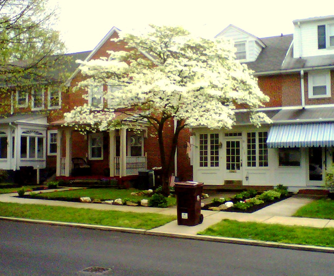 The dogwoods are now in full, spectacular bloom. I took this photo on a morning walk during the rather soggy start to this week. When the dogwood petals start falling, you can think you're in the middle of a snow flurry! This morning we have a blue, blue sky with nary a cloud - spectacular spring weather once again.